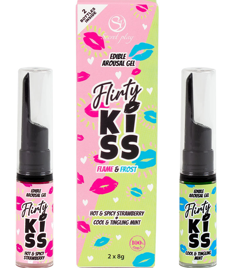 La marque Secret Play présente Flirty Kiss, un pack de 2 gels spécialement créé pour le sexe oral et les baisers. Chaque gel a une saveur gourmande 100 % comestible : fraise ou menthe et des effets surprenants : chaleur épicée ou fraîcheur et vibrations.Caractéristiques :- 2 gels pour le baiser et le sexe oral- 1 gel à la fraise avec un effet épicé et chaud- 1 gel à la menthe avec un effet frais et vibrant- 100 % comestible- À base de glycérine- Non testé sur des animaux- Sans parabène- Contenance : 2 x 8g- Fabriqué en Espagne- Convient aux végétaliens et aux intolérants au lactose, sans sucre- Marque : Secret PlayComposition Flirty Kiss Fraise : Glycérine E422, Eau, Humectant E420, Arôme, Colorant E124, Régulateur d´acidité E330, Conservateurs E202, E211, Épaississant E415, Stabilisant E1520, Edulcorant E954, Extrait de CapsicumComposition Flirty Kiss menthe : Glycérine E422, Eau, Humectant E420, Ar ômes, Extrait d´Acmella Oleracea, Colorants E102, E131, Menthol, Régulateur d´acidité E330, Conservateurs E202, E211, Épaississant E415, Stabilisant E1520, Edulcorant E954