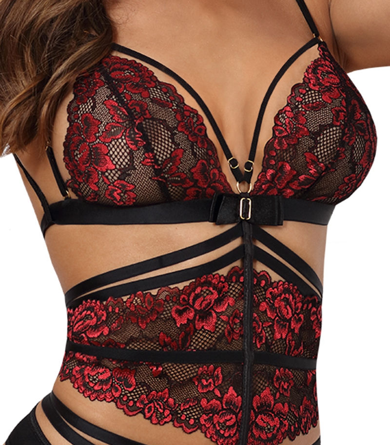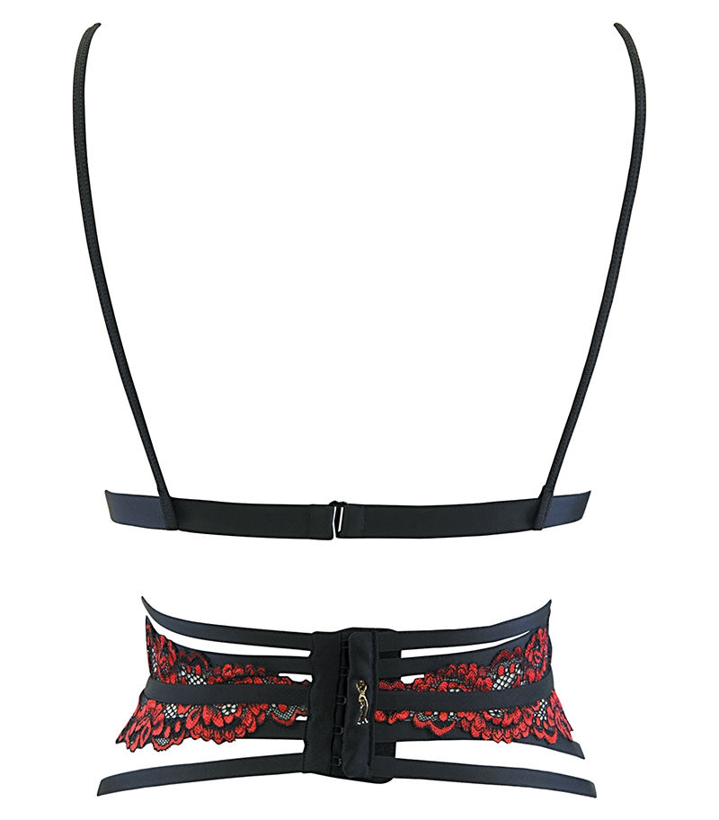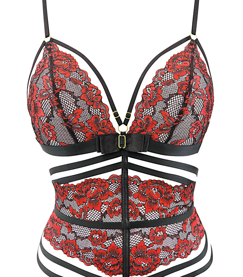 Soutien-gorge triangle prolongé d'un serre taille somptueux en dentelle noire et rouge.